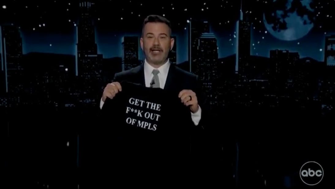 Kimmel endorses Minneapolis mayor’s anti-ICE messaging w/ new t-shirt: “Get the f*ck out of Minneapolis” [X, Elliott]