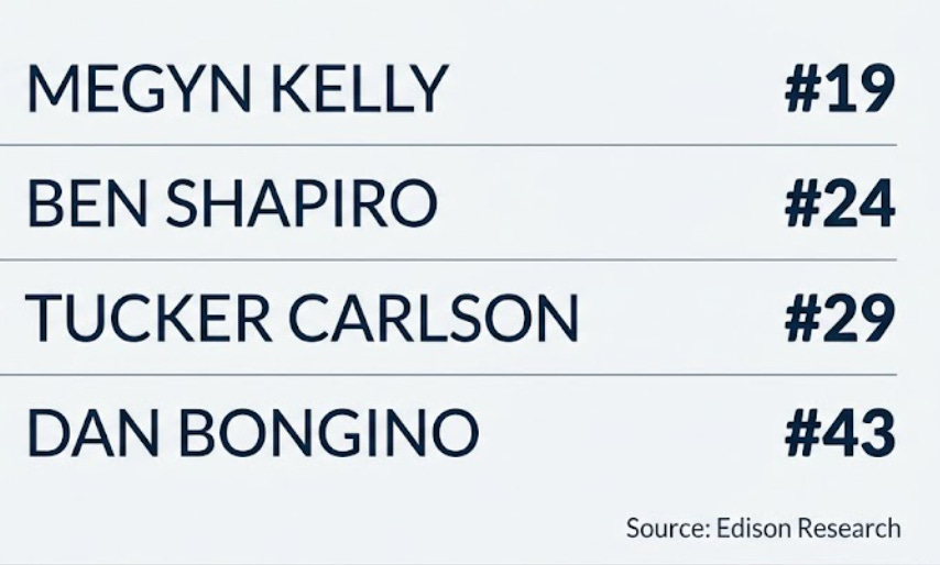 The Daily Wire is still thriving, with Ben Shapiro jumping to #24 in their rankings. Meanwhile, Megyn Kelly sits at #19, Tucker at #29, and Dan Bongino returned to the rankings at #43. - NRB