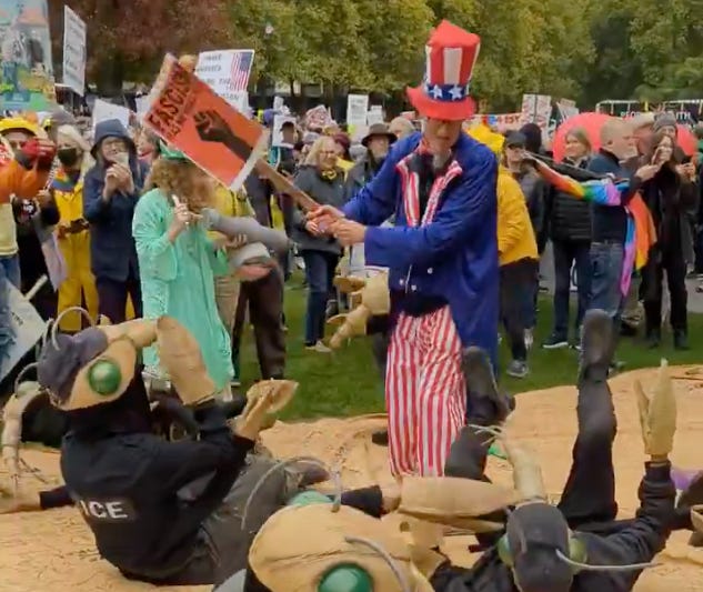 Grown adult protesters dressed up as āLICEā agents roll around on the U.S. Constitution at Seattleās āNo Kingsā protest. [X, Rugg]
