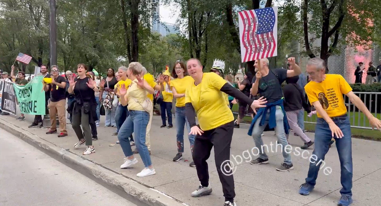 Demonstrators dancing at a āNo Kingsā protest today in Chicago [X, Gutenschwager]