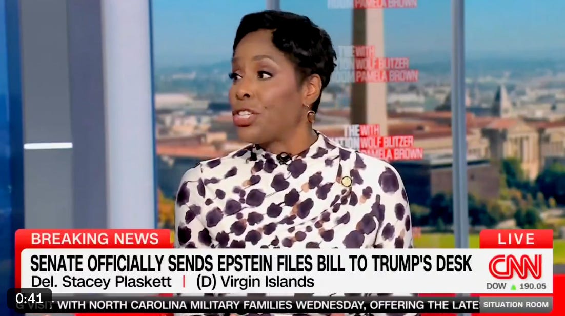 Collins: “Were Stacey Plaskett’s texts with Epstein appropriate?” … Jeffries: “She is not violating any House rule.” [X, Price]