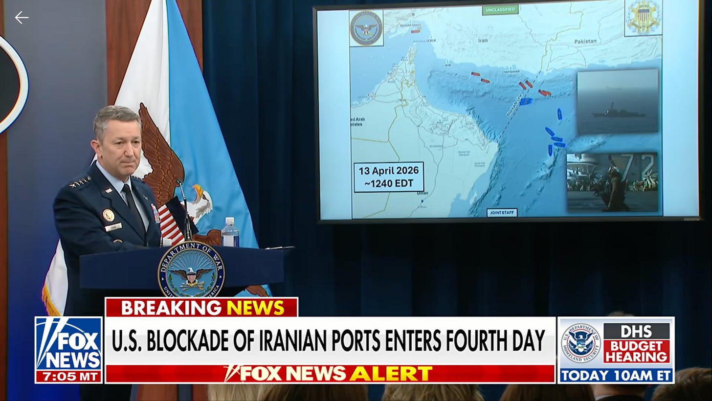 CENTCOM confirms the naval blockade has halted Iran’s trade, forced 13 ships so far to turn around, Treasury Sec. Scott Bessent says additional sanctions may be applied, Sen. Tom Cotton reports on China agreeing to not send weapons to Iran, first female protester to be executed by regime