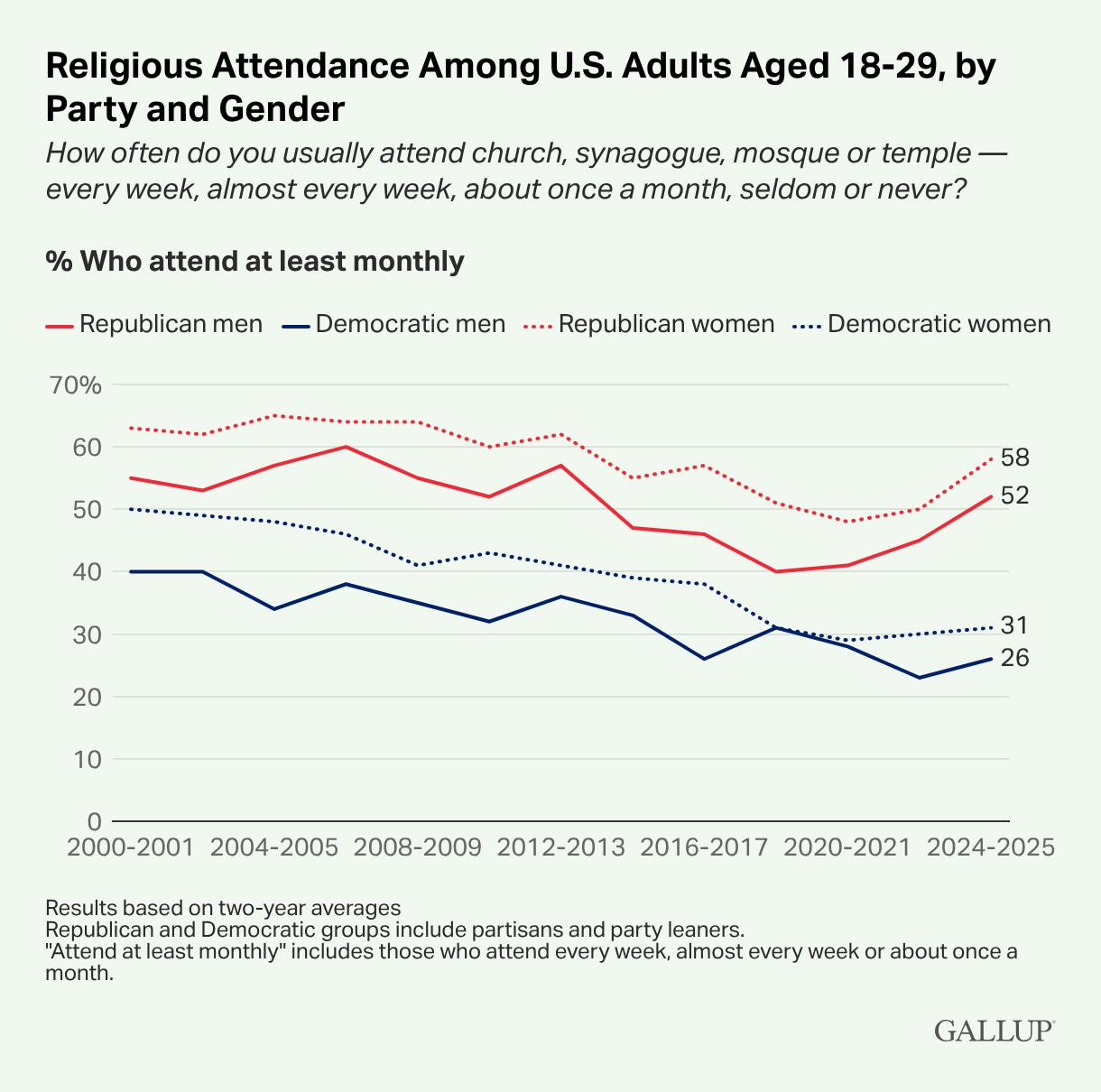 According to the report, young men have hit a 25-year high in expressed religiosity. This shift is driven almost entirely by young Republicans. A similar trend is emerging for young Republican women, who significantly outpace their Democrat peers in church attendance.