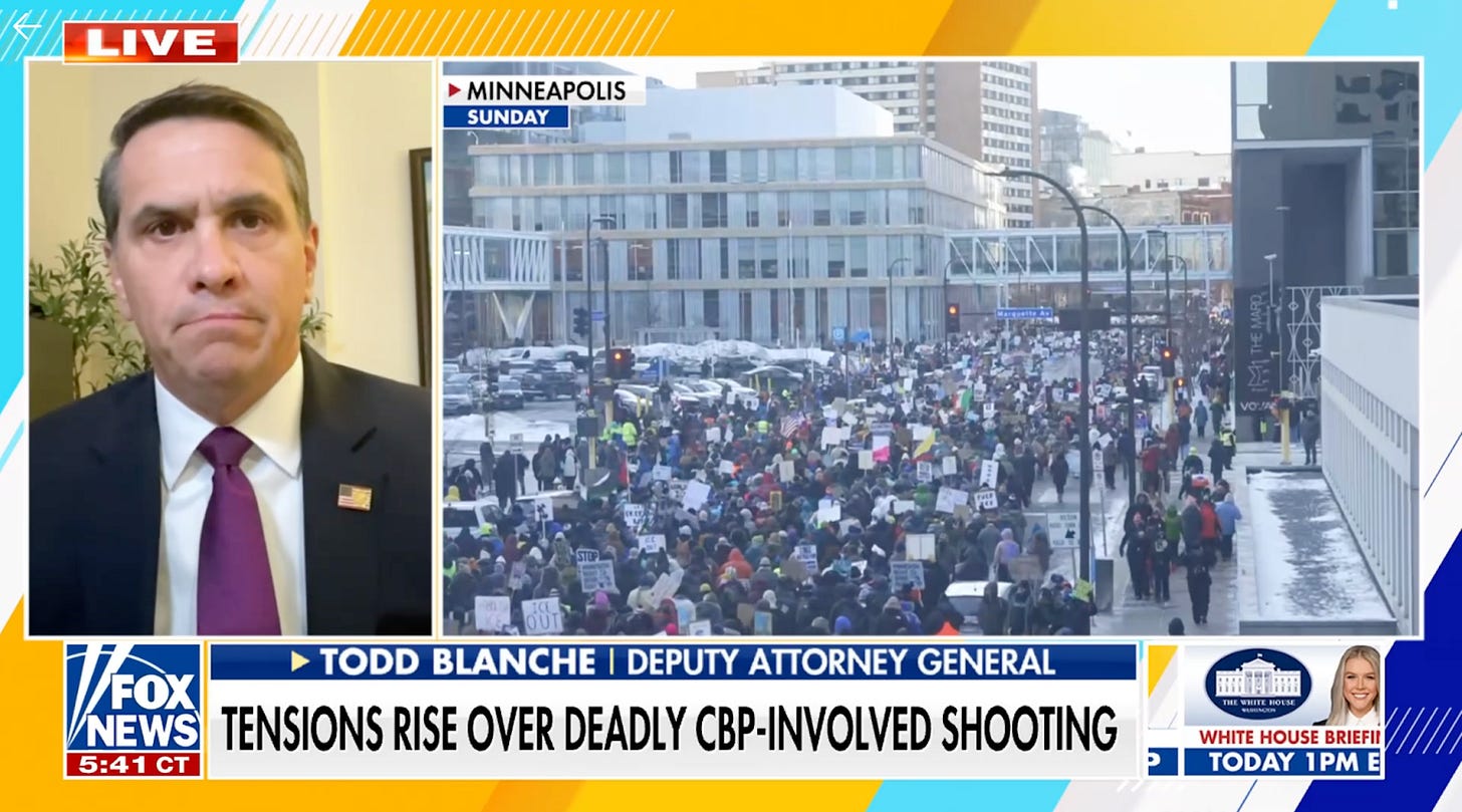 Border Czar Tom Homan will go to Minneapolis tonight, guest Deputy AG Todd Blanche encourages further video review of the shooting of Alex Pretti before classifying the case